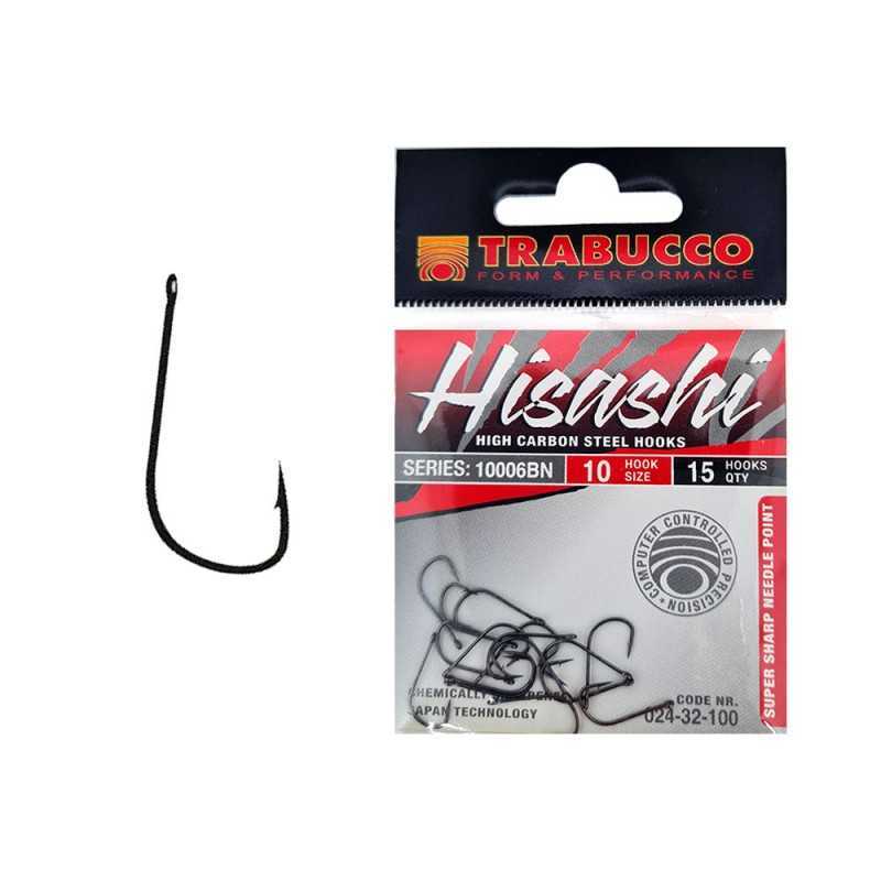 Amo Trabucco Hisashi serie 10006BN R è un amo dritto ad occhiello, finito in black nickel per avere una durata maggiore e per essere invisibile in acqua all' occhio del pesce. Legatura nell' asola per la massima mobilità, adatto per bigattino, caster e casteroni nei fiumi, ma anche in mare.