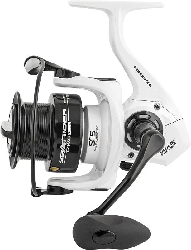 Mulinello Trabucco Searider PWG è un mulinello da Beach Ledgering, da bolentino. Il corpo è il rotore è composito di grafite. Ha 5 cuscinetti a sfera Long Life in acciaio inox e 1 cuscinetto a rullo con antiritorno infinito. L' alberino e ruota comando in acciaio inox. La frizione è micro-regolabile con dischi sovradimensionati. La bobina è superleggera in grafite, l' archetto a sezione maggiorata. Il rullino guidafilo Anti-twist è rivestito in Titanio, limita le torsioni del filo. La manovella è in alluminio con ampio pomello ergonomico.
