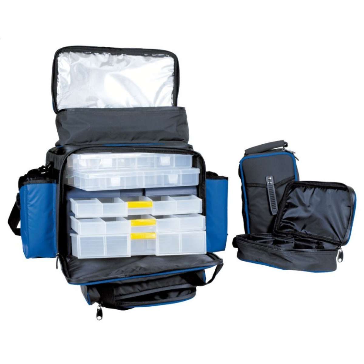 Tasca frontale (25 x 32 x 7,5 cm). Apertura frontale per un rapido accesso che ospita una cassa rigida con tre cassetti in plastica e due scatole indipendenti.
